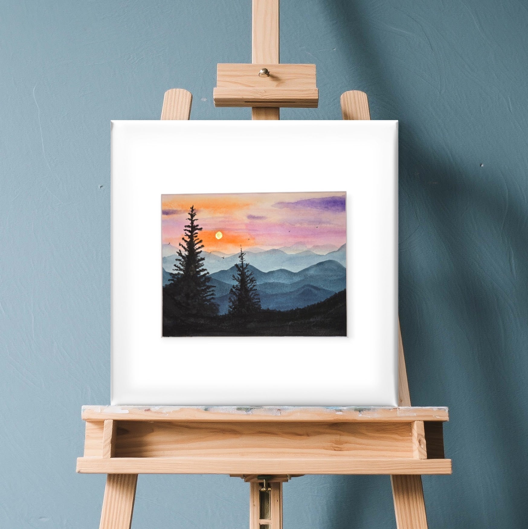Capture the peaceful glow of the mountains at dusk with Blue Ridge Sunset, a watercolor landscape inspired by the breathtaking views of the Blue Ridge Mountains. Layers of indigo and violet hills fade into the distance beneath a warm, golden sky — a moment of calm and connection to nature preserved in paint.