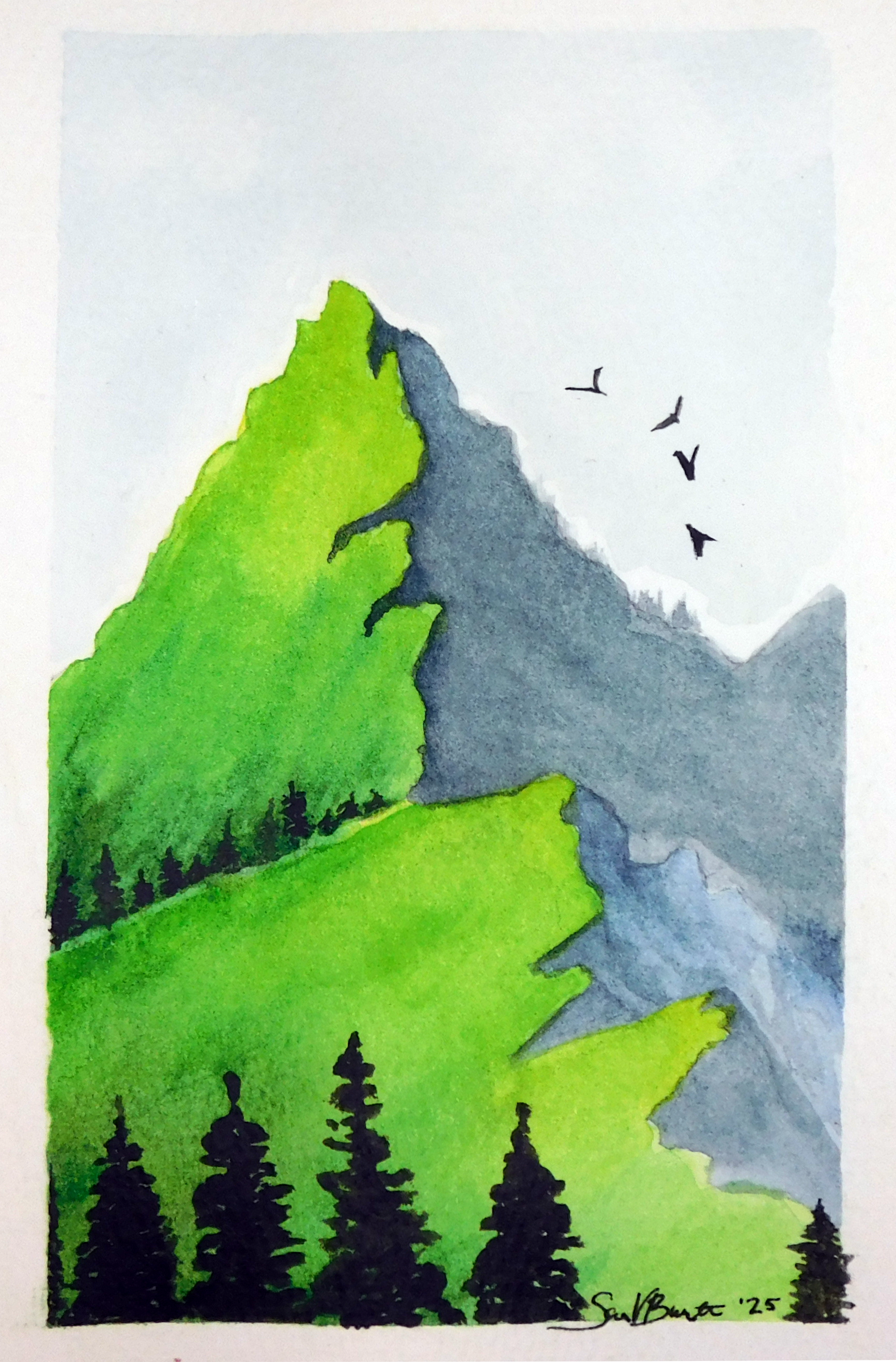 A bold and refreshing mountain scene painted in layers of rich green and deep gray-blue. Dark pines rise from the base while birds soar above the sharp ridges, adding a sense of scale and freedom. This piece captures the awe of standing before nature’s strength and beauty.