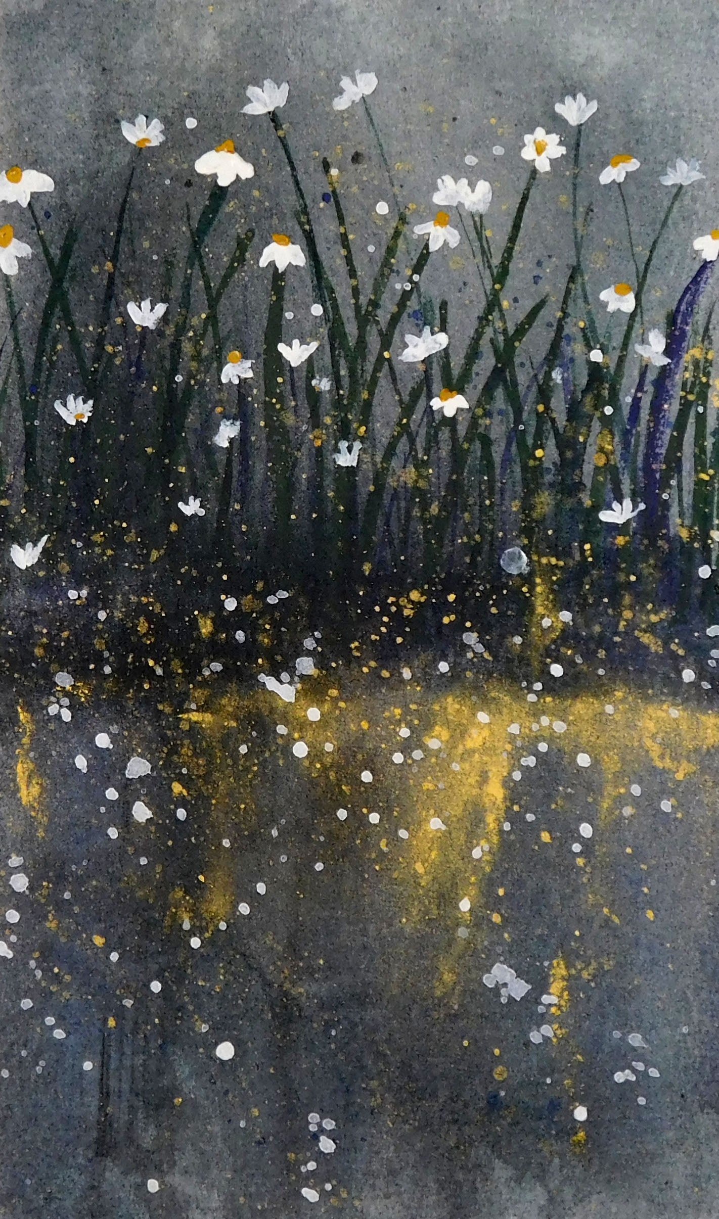 This piece is about finding beauty in unexpected places — light blooming from darkness. The daisies symbolize purity and resilience, while the golden flecks suggest moments of wonder and hope scattered through life’s shadows.